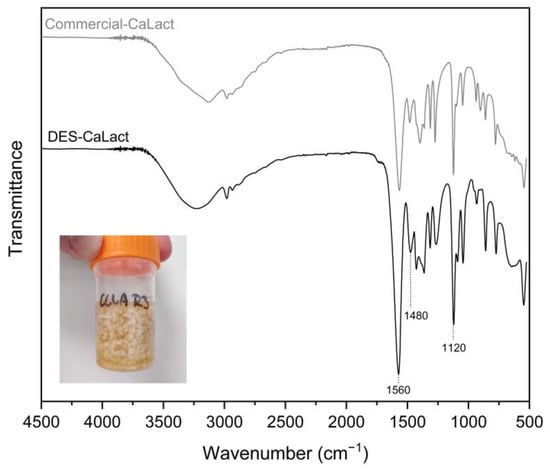ATR-FTIR spectra of calcium lactate (CaLact) obtained after DES extraction at R3 (general aspect is displayed), in comparison with commercial calcium lactate.