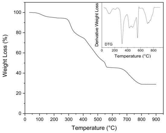 The TGA thermogram showed several different steps of decomposition, similarly to what was observed in the work of Mititelu et al. []. The first step between 30 and 200 °C with a weight loss of 5.5% corresponded to the evaporation of associated H2O molecules (Figure 8). Following this initial weight loss, a second weight loss of 19% was observed at a Tdmax of 291 °C, and another 30% between 370 and 510 °C. These two steps corresponded with the formation of mineral calcium carbonate (CaCO3). An additional step was observed at Tdmax 540 °C, corresponding with a 6.9% weight loss, which could be attributed to the decomposition of anhydrous calcium nitrate (from residual choline chloride or proteins) at 500–600 °C, producing CaO and NO2 []. In the final step, between 613 °C and 805 °C, the CaCO3 was transformed to calcium oxide (CaO) via calcination [,]. The final residue was 28.9%, corresponding to the calcium oxide.