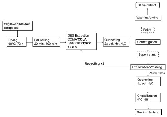 Furthermore, calcium salts of lactic acid (calcium lactate) also have good commercial potential as products of DES-mediated α-chitin extraction. Calcium lactate is a widely used additive in foods, authorized and commercialized under the E code E327, according to Regulation (EC) No 1333/2008. In the agricultural sector, it is also authorized for use in cattle, pig, and poultry feed []. It is also sold as a nutritional supplement in the US [] and the EU (mixed with calcium gluconate and calcium carbonate) [] and may be beneficial in the prevention of osteoporosis []. It can also be used as an additive to building materials to improve resistance []. Recently, other marine-derived raw materials, such as green crab exoskeletons [] and mussel shells, have been explored as potential raw materials for the production of calcium lactate [] by conventional extraction.