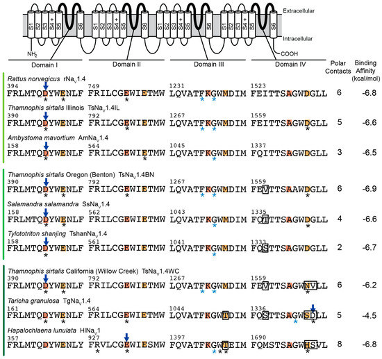 Figure 1. Summary of results for TTX docking in homology models of both TTX-resistant and TTX-sensitive voltage-gated sodium ion channels (VGSCs) using AutoDock Vina rigid channel analysis (VINA-R). Species names and channel protein names are listed above. Amino acid sequences from all four domains of the voltage-gated sodium ion channel that form the TTX binding site are aligned above. The channels are grouped by levels of resistance to TTX blocking: light green—low, medium green—moderate and dark green—“super-resistant” channels, along with a tetrodotoxic octopus Hapalochlaena lunulata. The selectivity filter (DEKA) and outer negatively charged ring (EEMD) pore motifs are shaded orange and yellow, respectively. Amino acid positions that form polar contacts with TTX are labeled with asterisks: black for contacts with atoms in sidechains and blue for contacts with atoms in the backbone. The amino acid position that forms a polar contact with the guanidine group on TTX is labeled with an arrow. The number of polar contacts identified by PyMOL between the channels and TTX in the pose with the lowest binding energy (mode 1 conformation) are listed. The binding affinity values, calculated using AutoDock Vina to dock TTX in the VGSCs, are listed. Amino acid substitutions at homologous positions in TTX-resistant channels are labeled with a box. A diagram of a typical VGSC is included to identify the regions in each of the four protein domains that together form the outer pore of the channel.