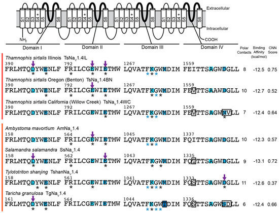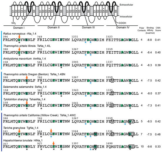 Figure 3. Summary of results for TTX docking in homology models of both TTX-resistant and TTX-sensitive voltage-gated sodium ion channels (VGSCs) using GNINA flexible sidechain analysis (GNINA-F). The search volume for docking was set using TTX bound in the TTX-sensitive channel for each lineage (snake TsNaV1.4IL and salamander AmNaV1.4) using GNINA rigid docking analysis (GNINA-R). Species names and channel protein names are listed above. Amino acid sequences from all four domains of the voltage-gated sodium ion channel that form the TTX binding site are aligned above. The channels are grouped by animal lineage; red (Thamnophis sirtalis) garter snake and orange salamander. The selectivity filter (DEKA) and outer negatively charged ring (EEMD) pore motifs are shaded light and dark blue, respectively. Amino acid positions that form polar contacts with TTX are labeled with asterisks: black for contacts with atoms in sidechains and blue for contacts with atoms in the backbone. The amino acid positions that form polar contacts with the guanidine group on TTX are labeled with arrows. The number of polar contacts identified by PyMOL between the channels and TTX in the pose with the lowest binding energy are listed. The binding affinity values and convolutional neural networks (CNN) scores, calculated using GNINA to dock TTX in the VGSCs, are listed. Amino acid substitutions at homologous positions in TTX-resistant channels are labeled with a box. A diagram of a typical VGSC is included to identify the regions in each of the four protein domains that together form the outer pore of the channel.