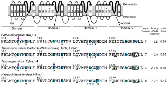 Figure 4. Summary of results for TTX docking in homology models of both TTX-resistant and TTX-sensitive voltage-gated sodium ion channels (VGSCs) using GNINA flexible sidechain analysis (GNINA-F). The search volume for docking was set using TTX bound in each channel using GNINA rigid docking analysis (GNINA-R). Species names and channel protein names are listed above. Amino acid sequences from all four domains of the voltage-gated sodium ion channel that form the TTX binding site are aligned above. The selectivity filter (DEKA) and outer negatively charged ring (EEMD) pore motifs are shaded light and dark blue, respectively. Amino acid positions that form polar contacts with TTX are labeled with asterisks, black for contacts with atoms in sidechains and blue for contacts with atoms in the backbone. The amino acid positions that form polar contacts with the guanidine group on TTX are labeled with arrows. The number of polar contacts identified by PyMOL between the channels and TTX in the pose with the lowest binding energy are listed. The binding affinity values and convolutional neural networks (CNN) scores, calculated using GNINA to dock TTX in the VGSCs, are listed. Amino acid substitutions at homologous positions in TTX-resistant channels are labeled with a box. A diagram of a typical VGSC is included to identify the regions in each of the four protein domains that together form the outer pore of the channel.
