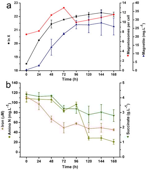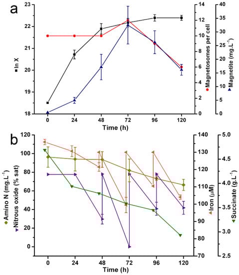 Consumption of N2O and Fe2+ was more intense between 48 and 72 h. In the latter time, the average magnetosome number per cell was the highest (11 per cell). Three pulses of both N2O and Fe2+ were needed to reach their initial concentration (Figure 1b). N2O and Fe2+ supplementation increased both the production and productivity of magnetite at 72 h (32.5 mg∙L−1∙day−1 and 39.7 mg∙L−1, respectively); production, productivity and average number of magnetosomes per cell decreased from this time point (reaching 16.1 mg∙L−1, 12.6 mg∙L−1∙day−1 and 6 magnetosomes per cell, respectively; Figure 1a). Succinate was consumed throughout growth, and its concentration at 120 h was 62% of that at the time of inoculation (Figure 1b).