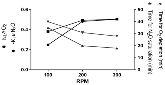 The determination of mass transfer of N2O and O2 was carried out by measurements of the concentration of these gases []. In the first step, a volume of artificial seawater (ASW) saturated with oxygen (previously purged with compressed air) was diluted with gas-free ASW (previously boiled and vacuum-cooled) to provide 2000 mL of a solution at approximately 10% oxygen saturation. This solution was transferred to the bioreactor vessel and purged with N2O at a flow rate of 0.5 L∙min−1 under stirring rates of 100, 200, and 300 RPM. The initial concentration of O2 and the elapsed time to reach zero reading by the sensor were recorded. In addition, the N2O saturation concentration (when no increase was detected by the sensor reading) and the time required to reach it were also measured. These data were used to calculate the mass transfer coefficient of N2O and O2 as