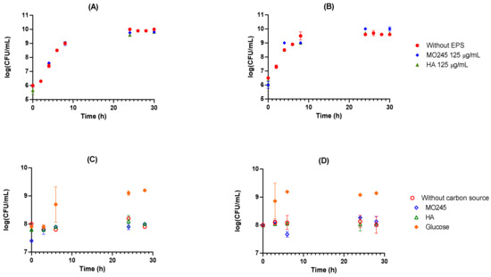 The cell concentration remained at 108 CFU/mL and did not significantly decrease over time in presence of MO245 or HA. MO245 and HA at 125 µg/mL have no bactericidal effect as shown in Figure 2C,D.