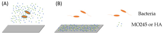 Conditions of use of MO and HA during adhesion. (A) Addition of MO245 or HA within the bacterial suspension and (B) glass slide conditioned with MO245 or HA.