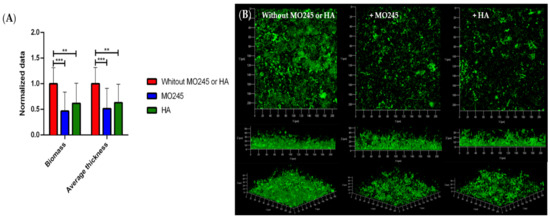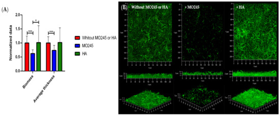 Impact of MO245 and HA on a 24 h P. aeruginosa biofilm maturation. (A) Biomass and average thickness quantification after COMSTAT analysis of confocal laser microscopy observations. (B) Confocal laser microscopy observation (Syto9®) without or with the addition of MO245 or HA at 125 µg/mL in the LB growth medium. Data represent the mean ± the standard deviation. * represents the significant difference at α 5%: p < 0.05, *** represents the significant difference at α 5%: p < 0.001.