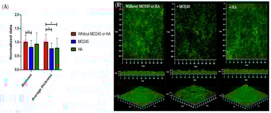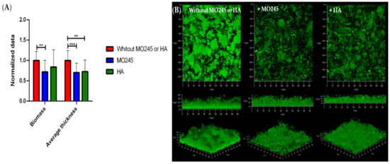 The impact of MO245 and HA on the disruption of P. aeruginosa biofilm (Figure 6) showed that MO245 and HA significantly decreased the average thickness by approximately 23%. However, only MO245 significantly decreased the biomass of the biofilm by 19% (p < 0.01).