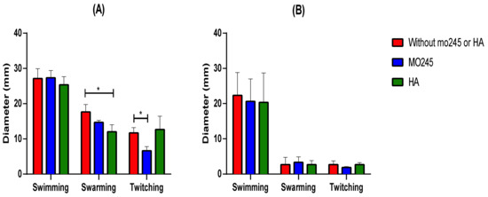 Motility assay of (A) P. aeruginosa and (B) V. harveyi incubated with MO245 or HA at 125 µg/mL or nothing for 2 h at room temperature. Diameters were measured after the overnight incubation of agar plates at 37 °C for P. aeruginosa and 28 °C for V. harveyi. Data represent the mean ± the standard deviation. * represents the significant difference at α 5%: p < 0.05.
