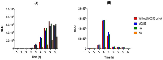 Anti-quorum sensing effect of MO245, HA, and kojic acid (KA) at 125 µg/mL on (A) the biosensor E. coli pSB401 and (B) V. harveyi for 9 h at 28 °C under 125 rpm agitation. Luminescence and O.D.600 were measured every hour and RLU ratios were calculated.