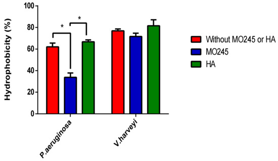 Results, Figure 10, showed that MO245 significantly decreased the surface hydrophobicity of P. aeruginosa from 62% to 34% (p < 0.05), in contrast to HA. However, the MATH assay did not show a change in the hydrophobicity of V. harveyi in the presence of MO245 or HA. The hydrophobicity of V. harveyi remained at approximately 76%.