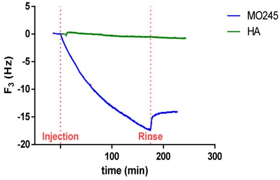 Evolution of the frequency F3 versus time for MO245 and HA on silica-coated quartz crystal (pH 7, 150 mM NaCl). MO245 and HA were injected at t = 0 min. After the adsorption of MO245 on the surface of silica-coated quartz crystal, rinsing was performed to observe if desorption occurred.