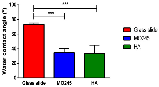 The water contact angle of a surface conditioned with MO245 or HA at 125 µg/mL measured with a Digidrop. A total of 3 mL of MO245 and HA were deposited on a glass slide and allowed to evaporate in a sterile environment. Contact angles were measured at room temperature with a volume of 3 µL. *** represents the significant difference at α 5%: p < 0.001.