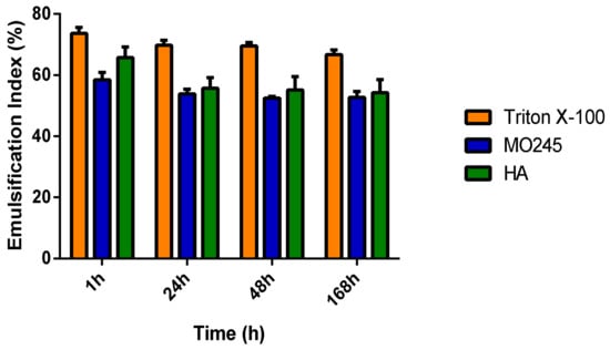 The results, Figure 13, showed that MO245 and HA are able to create an emulsion with olive oil. The results also highlight that they had a lower emulsion index than Triton X-100, around 60% for MO245 and HA compared to 70% for Triton X-100. However, they were able to keep the emulsion stable at around 60% up to 168 h. Both MO245 and HA had interesting surface-active properties.