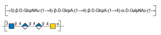 Analysis of the proton correlation system revealed that the unsaturated glucuronic residue of the second tetrasaccharide had very different chemical shifts and, notably, a more downfield anomeric proton Δ4,5UA2-H1 = 5.22 ppm. Inspection of the HMBC spectrum (Figure 4B) demonstrated that this residue was linked to the glucuronic acid residue (GlcA-H1 = 4.72 ppm). Considering the degradation modalities of the enzyme and what end-products could be obtained (Figure 5), it was hypothesized that the second tetrasaccharide had the chemical structure Δ4,5UA-β- 1,4-GlcA-β-1,4-GalNAc-α-1,3-GlcNAcrα/β. Inspection of the 1D and 2D NMR spectra confirmed the hypothesis, and the proton and carbon chemical shifts are reported in Table 1. The linkages between residues were demonstrated in the HMBC spectra and are highlighted in Figure 5B.