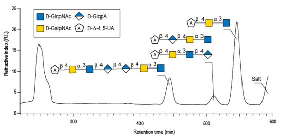 Purification by size exclusion chromatography of the enzymatic degradation products of diabolican incubated with the B. cellulosilyticus WH2 hyaluronan lyase. Inset: the structure of the oligosaccharides determined by NMR analyses.