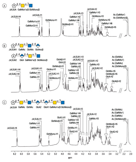 Characterization of the enzymatic degradation products of diabolican by the B. cellulosilyticus WH2 hyaluronan lyase. 1H NMR spectra of the trisaccharide (A), tetrasaccharides (B) and heptasaccharide (C) isolated after purification by chromatography. The spectra were recorded at 293 K.