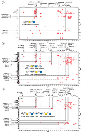 The peak at 510 min elution time in the size exclusion chromatogram was composed of two tetrasaccharides characterized by two distinct unsaturated glucuronic residues at the non-reducing end (Figure 3B). The first, Δ4,5UA1 (Δ4,5UA1-H4 = 6.05 ppm; Δ4,5UA1-H1 = 5.41 ppm), had proton and carbon chemical shifts similar to those reported on the unsaturated residue of the trisaccharide. The HMBC spectrum (Figure 4B) confirmed that it was linked to GalNAc, for which chemical shifts were also conserved, suggesting that this tetrasaccharide had the chemical structure Δ4,5UA-β-1,4-GalNAc-α-1,3-GlcNAc-β-1,3-GlcArα/β. This structure was validated by the complete attribution of the 1H and 13C chemical shifts by the 1H-13C correlation, demonstrating the linkages between the residues (Table 1).