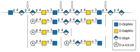 In-depth analyses of the oligosaccharides produced by the degradation of diabolican by the B.cellulosilyticus WH2 hyaluronan lyase confirmed once more the structure of the polysaccharide [6,11]. This polysaccharide, known to mimic glycosaminoglycan, is also subjected to enzymatic degradation using a glycosaminoglycan lyase. The structure of the oligosaccharide end-products demonstrated two sites of cleavage, either the β (1,4) linkage between GlcNAc and GlcA or between two GlcA, showing plasticity of the active site of the enzymes able to accommodate both GlcNAc and GlcA in position -1 of the active site.