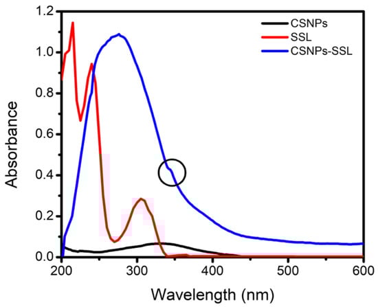 Optical properties of CSNPs, SSL, and CSNP–SSL were studied using UV–vis spectrophotometry. The UV–vis spectrum of CSNPs showed a broad absorption band at 334 nm, which corresponds to the n–π* transition of CSNPs [] (Figure 1). Moreover, the absorption bands of SSL at 305, 240, and 215 nm corresponding to the π–π* transition []. Compared with that of CSNP–SSL, the characteristic peak of SSL showed a blue shift from 305 to 276 nm and a small red-shifted hump at 344 nm, marked as a round shape in Figure 1. This blue shift was owing to the decrease in the size of CSNPs with maximum absorbance wavelength []. The results indicate that SSL was successfully encapsulated within CSNPs.