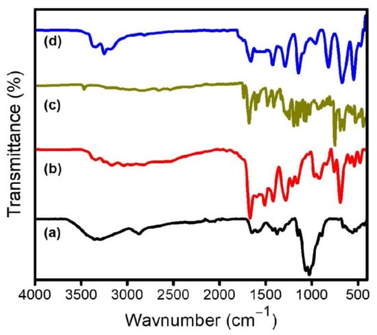 Fourier transform infrared spectra of CS (a), CSNPs (b), SSL (c), and CSNP–SSL (d).