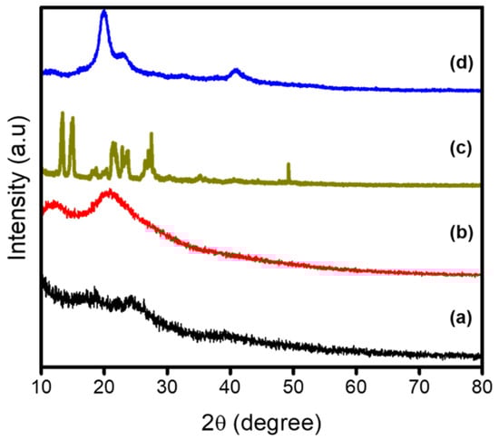 Figure 3 displays the XRD patterns of CS, CSNPs, SSL, and CSNP–SSL for the 2θ range of 10–80°. In contrast to CSNPs that have both peaks at 2θ of 11.8° and 20.7°, CS exhibited two peaks at 2θ of 17.1° and 24.6° (Figure 3a,b), indicating a significant degree of amorphous phase []. The basic diffraction peaks were displaced, and peak strength decreased after crosslinking of CS with TPP (Figure 3b). The XRD pattern of sharp diffraction peaks of SSL appeared at 13.1°, 15.8°, 18.7°, 21.3°, 22.8°, 23.7°, 27.4°, and 49.4° 2θ, as shown in Figure 3c []. Furthermore, new peaks appeared at 2θ of 19.3°, 23.4°, and 40.9°, indicating that the amorphous phase was induced by ionic interaction between SSL and CSNPs [] (Figure 3d). According to the XRD patterns, CSNP–SSL either took the form of a molecular or amorphous dispersion within the CS matrix. In conclusion, the removal of distinctive crystalline peaks of SSL was consistent with earlier studies because SSL was completely coated and encased by CSNPs, or it may be changed into an amorphous condition.