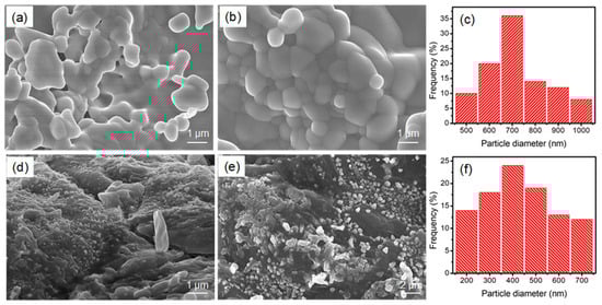 Scanning electron microscopic (SEM) images of CSNPs (a,b) and SSL-loaded CSNPs (d,e) and particle size diameter histogram of CSNPs (c) and SSL-loaded CSNPs (f).
