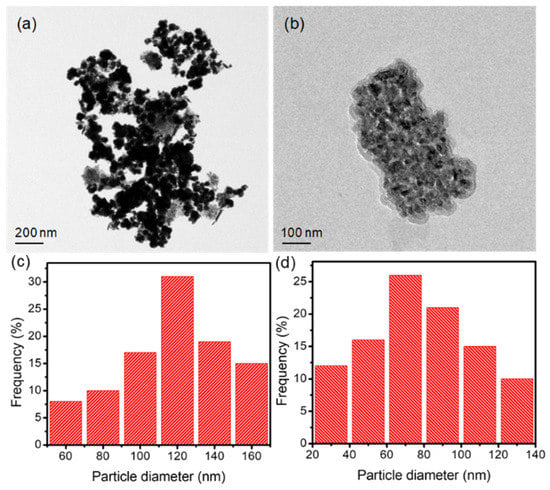 Transmission electron microscopic images of CSNPs (a) and SSL-loaded CSNPs (b) and particle size diameter histogram of CSNPs (c) and SSL-loaded CSNPs (d).