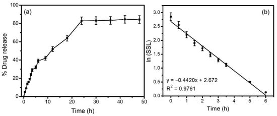 Sudden and sustained release are the two possible drug release profiles of NPs. Drugs adsorbed onto the surface of NPs produce the initial burst phase. A gradual diffusion of the drug from the polymer matrix and the breakdown of the carrier matrix is responsible for sustained drug release []. The in vitro release and kinetics study of SSL from CSNPs using phosphate buffer of pH 7.4 for 48 h is depicted in Figure 6. The released percentage was calculated concerning the encapsulated SSL concentration. In the first phase, there was an initial burst release of around 64.2 ± 3.2% at 6 h [], followed by a slow release from 6 to 24 h when around 84.6 ± 4.23% of the SSL drug was released [], as shown in Figure 6a. The burst release of the drug could be due to the dissolution of the surface SSL drug that is poorly entrapped in the polymer matrix, and slow release is due to diffusion of the SSL drug present in the core of CSNPs. The drug release was observed to be prolonged by CSNPs in comparison to that by the SSL solution. As seen in Figure 6b, the SSL concentrations increase dramatically over 6 h. A recent study on drug release kinetics [] suggests that the release response follows first-order kinetics. In the first 6 h of our experiment, when the release of SSL from CSNP-SSL is the main process, we also investigated the release kinetics. With an R2 value of 0.9761 in the CSNP-SSL, the rate of dissolution and concentration of the SSL medication obeyed first-order kinetics. Based on the results, it may be conceivable to develop CSNP-SSL into a potent tool for biomedical applications that need the controlled release of medications into a biological system over an extended time.