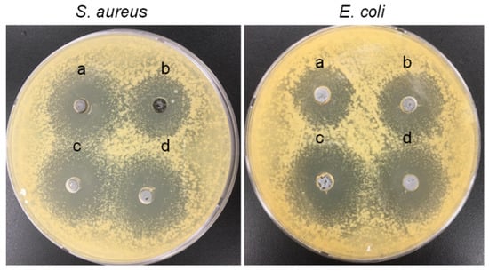 Inhibition zones of (a) control, (b) CSNPs, (c) SSL, and (d) CSNP–SSL against Staphylococcus aureus and Escherichia coli were determined using the agar diffusion method.