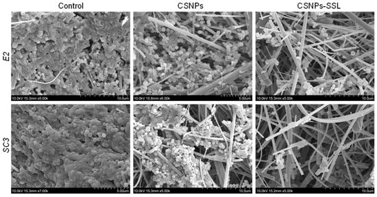 SEM images of antibiofilm of Enterobacter tabaci (E2) and Klebsiella quasipneumoniae (SC3) treated with CSNPs and CSNP–SSL.