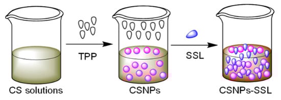 The ionic gelation process with a few minor modifications [,] was used to synthesize CSNPs. In brief, 0.5% (w/v) CS was dissolved in a 1% (v/v) acetic acid solution, and its pH was adjusted to 6.5 using NaOH. SSL powder was precisely measured and mixed with deionized water (DW) to prepare a solution of 50 mg/mL concentration. The SSL solution was added dropwise to the chitosan solution (CS and SSL ratio of 1:1) and was thoroughly mixed for 30 min with a probe sonicator (Q500 sonicator; 750 W, 20 kHz, diameter ~ 7 mm). The combination was then added to 2.5 mL of 1.5 mg/mL of (2% w/v) sodium tripolyphosphate (TPP) solution by stirring (JSHS-18A Analog hotplate Stirrer) at 600 rpm at 37 °C. The CSNP–SSL was spontaneously generated under probe sonication after the addition of TPP. After centrifuging (Avanti J-26S Series) the resulting NPs at 10,000 rpm for 15 min at 4 °C, the supernatant was discarded, and the CSNP–SSL was subsequently dissolved in DW. The same process was used to prepare CSNPs without SSL (Scheme 1).