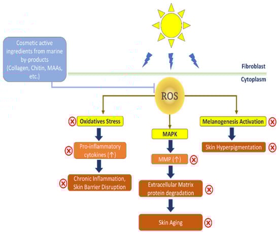 The MAAs are crucial for sunlight absorption and protects marine organisms from UV radiation []. The MAAs content in seaweed varies between species and seasons [], and red algae have been suggested as the potential source of MAAs []. Ryu et al. [] showed that the methanol extract of Corallina pilulifera methanol had vigorous antioxidant activity and protective effects against UVA-induced oxidative on human skin fibroblast. MAAs-Porphyra-334 from Porphyra protected human skin fibroblasts from UVA-induced photoaging through suppressed ROS production and the expression of MMPs, as well as increasing the extracellular matrix component levels of procollagen, type I collagen, and elastin [].