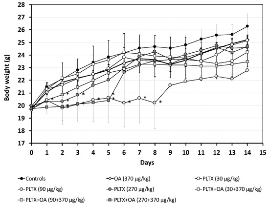 Body weight of mice from the day of treatment (D 0) up to 14 days of recovery (D 14). At days 0 and 1: data are the mean ± S.E. of 16 values (controls, OA 370 μg/kg) or 8 values (other groups of treatment, with exception at day 1: data are the mean ± S.E. of 6 values for PLTX 90 μg/kg, PLTX 270 μg/kg, PLTX+OA 90+370 μg/kg and PLTX+OA 270+370 μg/kg); from days 2 to 14: data are the mean ± S.E. of 3 values (with exception at day 8 and 5: data are the mean of 2 values for PLTX 90 μg/kg and for PLTX+OA 270+370 μg/kg, respectively); * p < 0.05 at the analysis of variance, in comparison with controls.