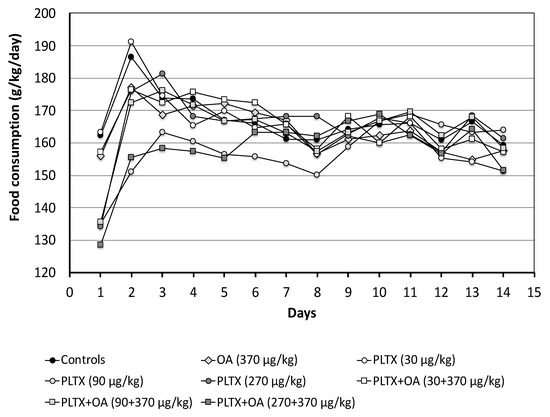 A reduced food intake was also recorded during the 14-day recovery in mice treated with the mid-PLTX dose as a single toxin (9–19% reduction, up to day 8) and in those co-administered with OA and the high PLTX dose (7–17% reduction, up to day 5). In the latter, food consumption up to day 5 was lower than that of mice administered with the same dose of PLTX or OA as individual toxins (7–13% or 10–12%, respectively) (Figure 2).