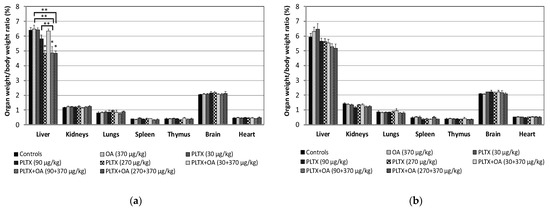 Organ to body weight ratios of mice recorded within 24 h after treatment (a) and during the recovery period up to 14 days from the treatment (b). (a) Data are the mean ± S.E. of 10 mice (controls, OA 370 μg/kg) or 5 mice (other groups of treatment); (b) Data are the mean ± S.E. of 6 mice (controls, OA 370 μg/kg) or 3 mice (other groups of treatment); * p < 0.05 at the analysis of variance, in comparison with controls; ** p < 0.05 at the analysis of variance, as compared between mice administered with PLTX (90 μg/kg) or OA (370 μg/kg) as single toxins and those co-administered with PLTX and OA (90 and 370 μg/kg), or between mice treated with OA (370 μg/kg) as a single toxin and those co-administered with PLTX and OA (270 and 370 μg/kg).