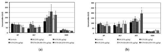 Serum levels of alkaline phosphatase (AP), alanine aminotransferase (ALT), aspartate aminotransferase (AST) and glutamate dehydrogenase (GDH) recorded in mice within 24 h after treatment (a) and during the recovery period up to 14 days from treatment (b). (a) Data are the mean ± S.E. of 8 mice (controls, OA 370 μg/kg) or 5 mice (other groups). (b) Data are the mean ± S.E. of 6 mice (controls, OA 370 μg/kg) or 3 mice (other groups); * p < 0.05 at the analysis of variance, in comparison with controls.