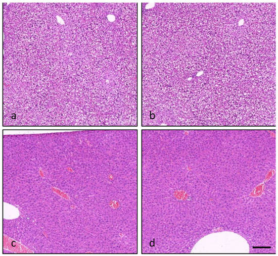 Light micrographs of the liver from a control mouse (a), a mouse administered with OA (370 μg/kg; (b) or PLTX (270 μg/kg; (c)) and a mouse co-administered with OA and PLTX (370 and 270 μg/kg, respectively; (d)), showing fine vacuolated and granulated hepatocytes’ cytoplasm (a,b) and its reduction (c,d). Images are representative of 5 mice. Hematoxylin–eosin stain; magnification 10×; bar: 100 μm.