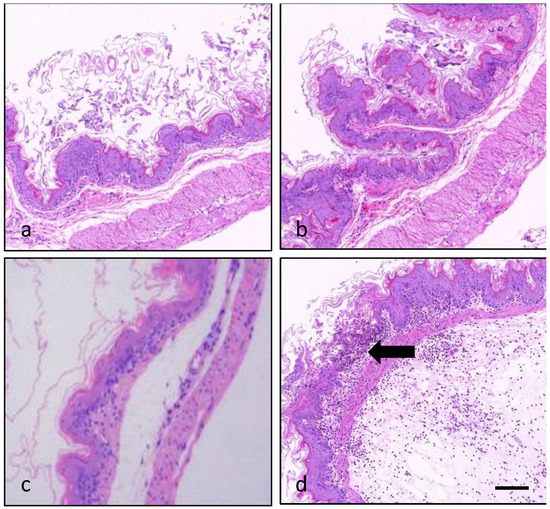 Light micrographs of the forestomach from a control mouse (a), a mouse administered with OA (370 μg/kg; (b)) or PLTX (270 μg/kg; (c)) and a mouse co-administered with OA and PLTX (370 and 270 μg/kg, respectively; (d)), showing a slight ulcer ((d), arrow) accompanied by inflammatory cells infiltration and edema in the submucosa ((d), bottom right part). Images are representative of 5 mice (a,b) and 2 mice (c,d). Hematoxylin–eosin stain; magnification 10×; bar: 200 μm.
