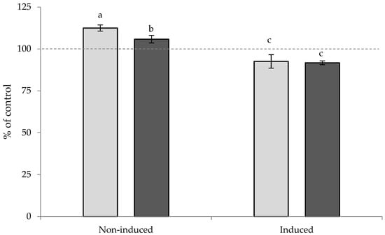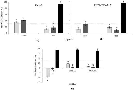 Metabolic inhibition of the distinct cell lines when in contact with dimethyl sulfoxide (DMSO; control (■)), Ctrl (■), or Str (■) extracts. The dashed line (--) indicates the 30% significant inhibition threshold. In (a,b), extracts at 1000 and 800 µg/mL are shown, and in (c), extracts solely at 800 µg/mL are shown. Results are expressed as average ± standard deviation (n = 3). Within each individual cell line, and within each concentration, values with the same letter are not significantly different (p > 0.05).