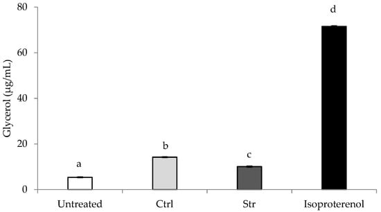 Compared with the control (non-treated cells), the results (Figure 2) revealed a significant (p < 0.05) increase in glycerol release by the 3T3-L1 differentiated adipocytes when in the presence of both extracts. The non-treated cells released 5.4 ± 0.2 µg/mL of glycerol, while cells treated with lipid extracts released 14.2 ± 0.2 and 10.1 ± 0.3 µg/mL (Ctrl and Str, respectively).