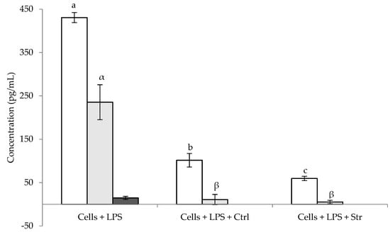 The determination of the concentration of the cytokines in non-stimulated cells revealed no production of those compounds, neither in the control cell, nor in cells exposed to either of the extracts. Contrastingly, when stimulated by LPS (Figure 4), as expected, the control cells secreted all the assessed cytokines, while the presence of the extracts led to decreased amounts thereof. Concerning the impact of the extracts on the expression of the inflammatory markers, cells in contact with the Ctrl presented lower amounts than those found in the control (cells + LPS), and when exposed to the Str, the decrease was even higher, registering the lowest concentrations.