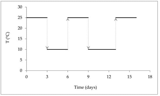 The microalga used in the study was Nannochloropsis oculata CCAP 849/1, (SAMS Ltd., Scottish Marine Institute, Scotland, UK). The culture was grown in modified artificial seawater medium (ASW) [] for 16 days, under two temperature regimens: one isothermal at 25 °C, which served as the control, and one in which the temperature was modulated throughout growth (Figure 5) to stress the cells in a modulated fashion, thus increasing the EPA concentration without decreasing cell growth, according to the method described by Sousa et al. (2022) []. The cultures were designated as Ctrl and Str, respectively. Both were grown under a continuous light intensity of 75 µmol photons/m2/s, provided by cool daylight fluorescent lamps (Lumilux L18W/865, OSRAM, Munich, Germany), in a climate chamber S600PL (Aralab, Rio de Mouro, Portugal).