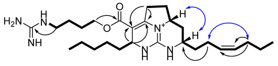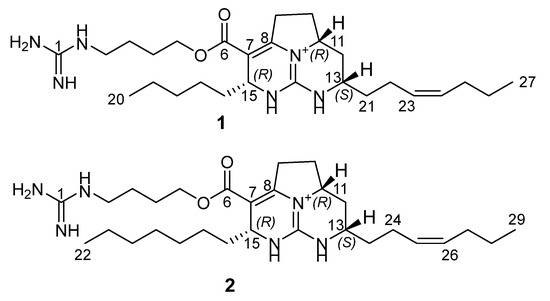 The crude EtOH extract of the marine sponge Monanchora pulchra was concentrated in vacuo and the obtained residue was fractionated by flash chromatography on a YMC*Gel ODS-A column. Further separation using reversed-phase HPLC resulted in the isolation of two new batzelladines O (1) and P (2) (Figure 1). The batzelladine 1 gave [M]+ ion at m/z 487.3750 in the HRESIMS spectrum, appropriate for the molecular formula C27H47N6O2, and a peak at m/z 244.1921, corresponding to a doubly charged [M + H]2+ ion. An intense fragment ion peak at m/z 374.2800 [C22H36N3O2]+ in HRESIMS/MS showed a loss from the molecular ion of 113 Da, corresponding to the 4-guanidino-1-butyl, also observed in some batzelladines [26,33]. 13C NMR data (Table 1) implied two C=C bonds (δC 129.2 and 132.2, and 103.7 and 151.3), one ester carbonyl (δC 166.2), and two guanidine carbons (δC 149.9 and 158.8). Detailed analysis of the 1H, 13C, COSY, HSQC, and HMBC NMR spectra of 1 (Table 1) revealed a close structural similarity between 1 and batzelladine C isolated from Batzella sp. [26], except that additional olefinic resonances were observed (δH 5.39, 5.45; δC 129.2, 132.2). In the COSY spectrum, there was presented a sequential spin system from the terminal methyl CH3-27 (δH 0.92) to CH2-25 (δH 2.06) through CH2-26 (δH 1.40), while in the HMBC spectrum the methylene protons H2-25 showed couplings to C-23 (δC 129.2) and C-24 (δC 132.2) (Figure 2), indicating a Δ23 unsaturation. The H2-22 (δH 2.19) allylic protons were in turn coupled to signals at δH 1.75 and 1.64 in the COSY experiments and gave HMBC correlation with C-13 signal at δC 51.9. The 13C chemical shifts of C-22 (δC 23.7) and C-25 (δC 30.4) suggested a Z configuration for this double bond, as in batzelladine E [26], proved by the synthesis [34]. This was further confirmed by an NOE correlation between H2-22 and H2-25 methylene protons (Figure 2).