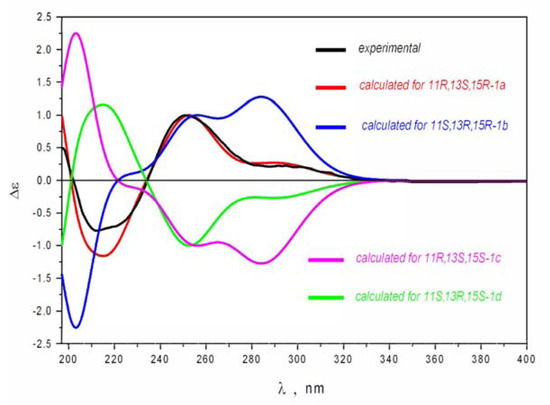 The absolute configurations of the stereogenic centers of 1 were established by quantum-chemical calculations of ECD spectra (Figure 3 and Figure S15). The ECD spectra for four stereoisomers 11R,13S,15R-1a, 11S,13R,15R-1b, 11R,13S,15S-1c, and 11S,13R,15S-1d were calculated using GAUSSIAN_16 software (Gaussian Inc., Wallingford, USA). The main features of the experimental ECD spectrum of 1 are well reproduced with the ECD spectrum calculated for the 11R,13S,15R-1a stereoisomer. The spectrum of 11S,13R,15R-1b does not reproduce the features of a negative band in the 190 ≤ λ ≤ 235 nm region; the ratio of intensities for two positive bands η = I(λ = 295 nm)/I(λ = 252 nm) is also overestimated.