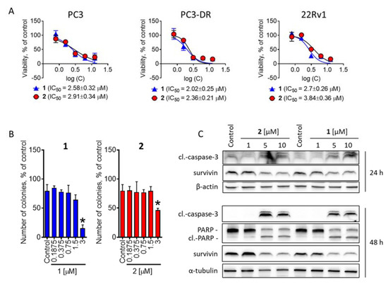 Cytotoxic activity in prostate cancer cells. (A), Cytotoxicity profiles of compounds 1 and 2 in PC3, PC3-DR, and 22Rv1 cells. The cells were treated with the investigated compounds for 72 h and the cell viability was measured using MTT assay. (B), Colony formation assay. 22Rv1 cells were treated with the indicated concentration of the investigated compounds for 48 h, and then the media was exchanged followed by incubation for additional 14 days. The colonies still alive were fixed, stained, and counted by naked eye. (C), Analysis of protein expression. 22Rv1 cells were treated with indicated concentration of the tested compounds for 24 h or 48 h and the protein expression was analyzed by Western blotting. Significant difference from control is indicated as * (p < 0.05, one-way ANOVA).
