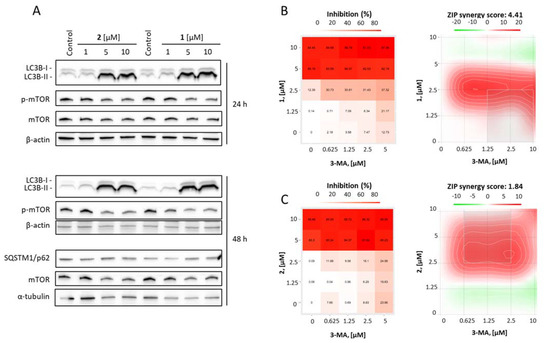 Analysis of the effect on autophagy. (A), Analysis of protein expression. 22Rv1 cells were treated with the indicated concentrations of the tested compounds for 24 h or 48 h and the protein expression was analyzed by Western blotting. (B,C), Effect of 3-methyladenine on cytotoxic activity of the compounds 1 (B) and 2 (C). 22Rv1 cells were treated with the indicated concentrations of the single drugs and their combinations for 72 h and viability was measured using MTT assay. The cytotoxic heat maps (left panels) and synergy maps (right panels) were generated using SynergyFinder 2.0 software. Red areas indicate synergistic effects of the combinations of specific concentrations of the drugs, green areas indicate antagonistic effects (right panels).