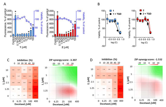 P-gp-independent effect of the compounds. (A), Effect on p-glycoprotein activity. PC3-DR cells were treated with indicated concentration of the drugs for 30 min and then incubated with calcein-AM solution for 15 min. The green fluorescence was measured using Infinite F200PRO TECAN plate spectrophotometer. Tariquidar (TQD, 50 nM) was used as a positive control. The effect of the drugs on cell viability was measured using MTT assay in the same experimental settings, the percentage of viable cells is indicated as a blue curve. (B), Effect of tariquidar (TQD) on cytotoxic activity of the compounds. PC3-DR cells were pre-treated with 50 nM TQD for 1 h and then co-treated with indicated concentration of the compounds for additional 72 h. The cellular viability was measured using MTT assay. (C,D), Effect of the compounds 1 (C) and 2 (D) in combination with docetaxel. PC3-DR cells were co-treated with indicated concentration of the single drugs and their combination for 48 h and viability was measured using MTT assay. The cytotoxic heat maps (left panels) and synergy maps (right panels) were constructed using SynergyFinder 2.0 software. Red areas indicate synergistic effects of the combination of specific concentrations of the drugs, green areas indicate antagonistic effects (right panels). Significant difference from control is indicated as * (p < 0.05, one-way ANOVA).