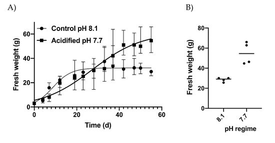 (A) Growth patterns in control (pH 8.1) and acidified (pH 7.7) conditions expressed as mean values ± SD, and (B) final fresh weight of algae obtained at the two pH regimes. Dots indicate the replicates. The horizontal lines indicate the mean values.