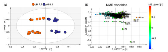 (A) OPLS-DA score plot showing NMR spectra projections of alga samples at pH 7.7 (orange dots) and pH 8.1 (blue dots) discriminated along with the first component. (B) Loadings are associated with the score plot in (A) and indicate the variables responsible for data discrimination.